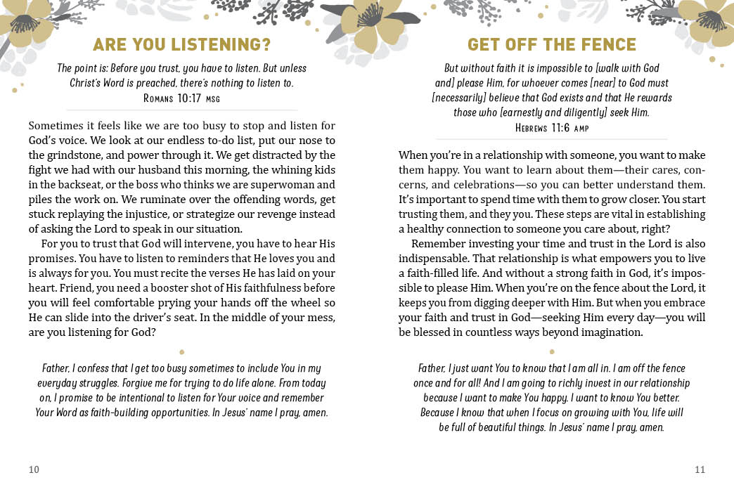Tiny Faith Can Move Mountains! Want to increase your faith? . . .This beautiful large print devotional offers just the encouragement, inspiration, and biblical truth you need. 180 full-length devotional readings touch on topics important to you, including: Prayer, God's faithfulness, God's love, Troubles, Uncertainty, Anxiety, Doubt, Trust, And more! This lovely package will encourage you to bloom and bask in the light of the heavenly Creator, making your quiet time with Him more precious and purposeful.