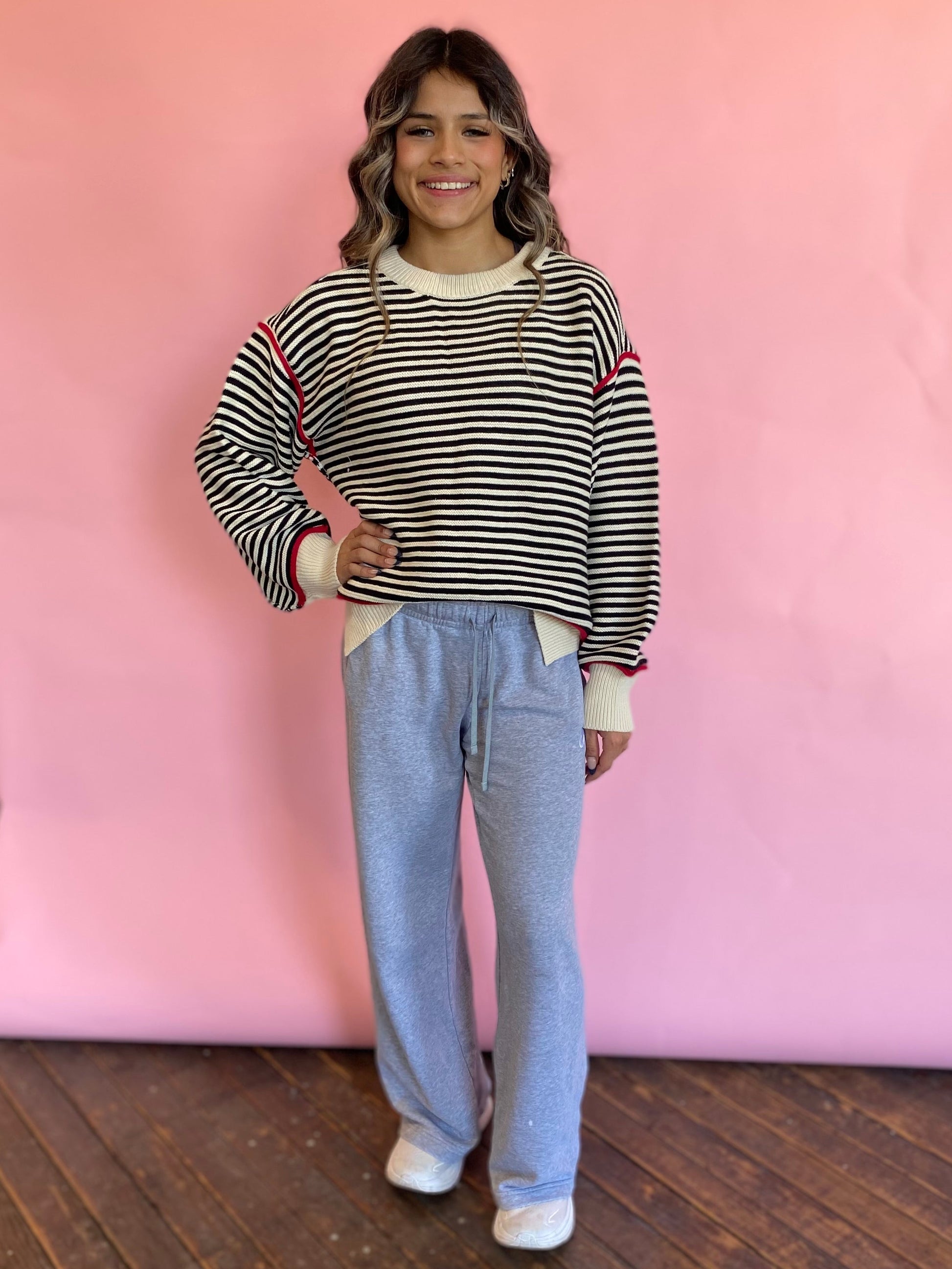 BLACK AND CREAM STRIPED SWEATER WITH RED ACCENT, CREW NECK, LONG SLEEVE, SLIT SIDES
