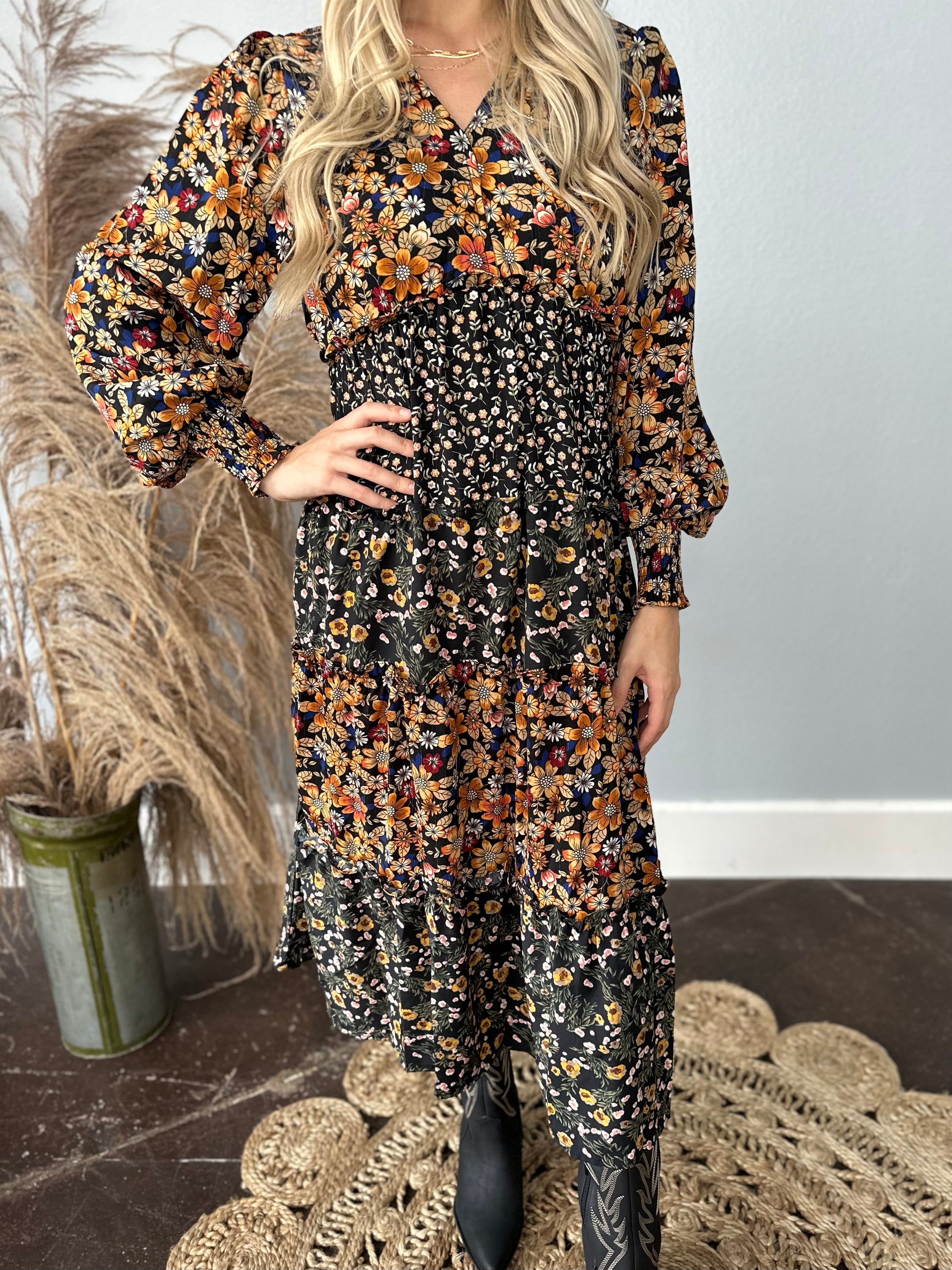 MIXED FLORAL PATTERN, TIERED, LONG SLEEVE DRESS WITH V NECK