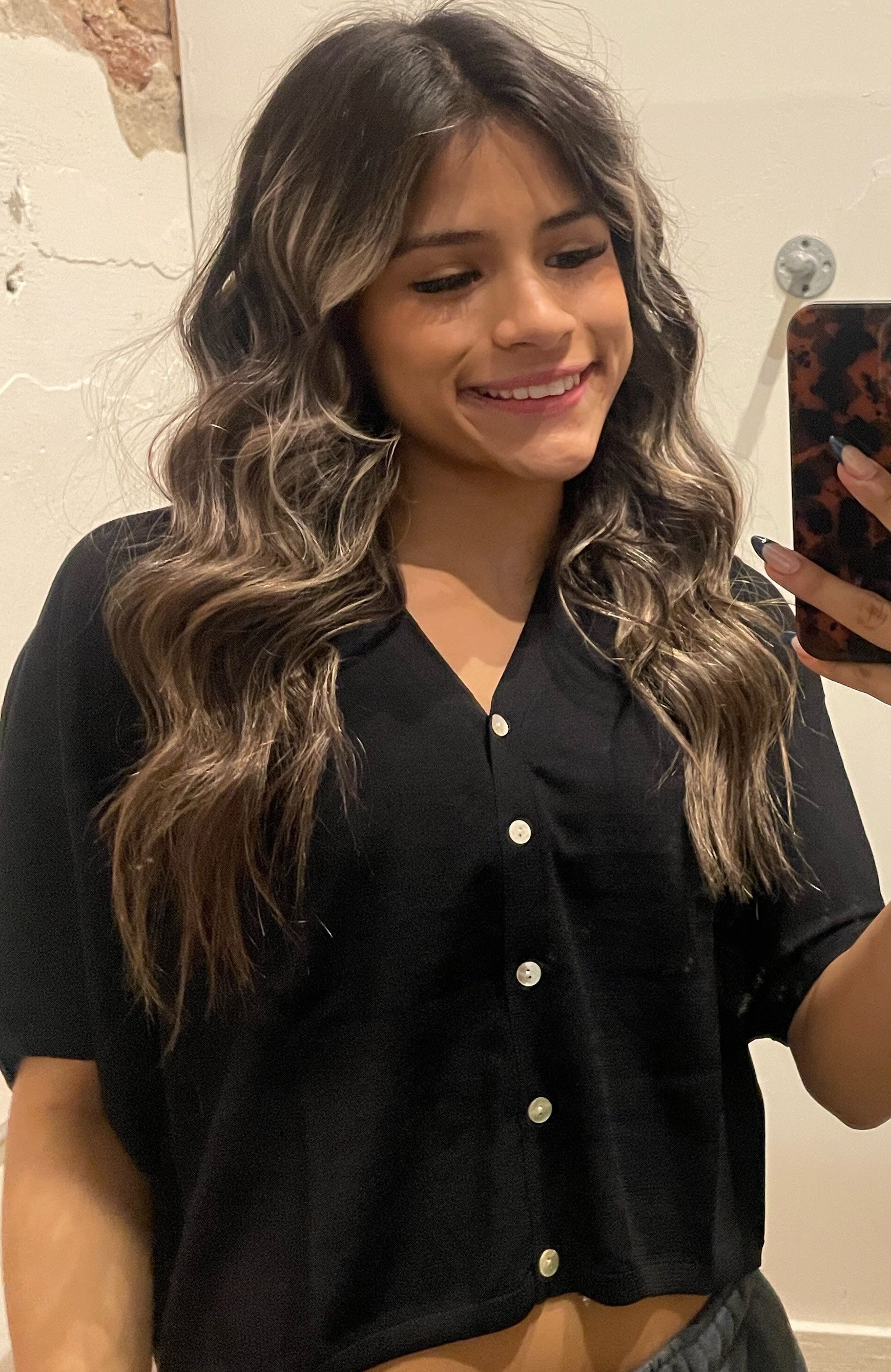 BLACK, OVERSIZED, CROP, BUTTON UP, V NECK, RIBBED, SHORT SLEEVE TOP