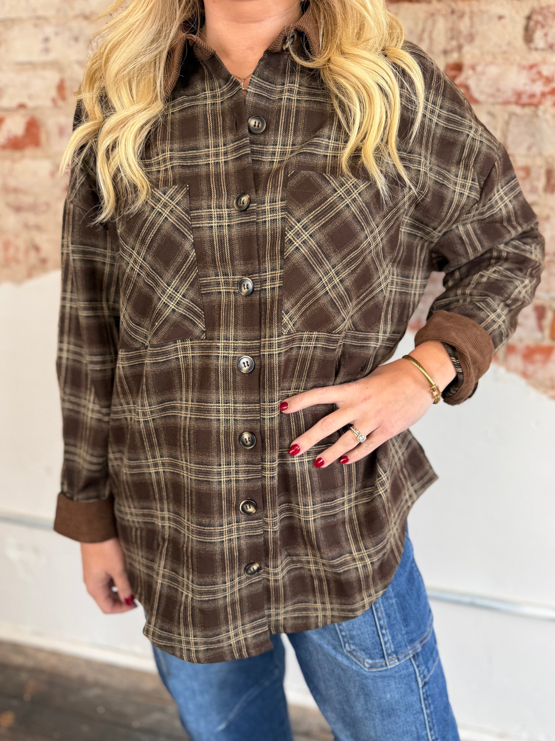 BROWN COLORED PLAID SHACKET WITH BROWN CORDUROY COLLAR AND CUFFS, BUTTON UP, FRONT POCKETS