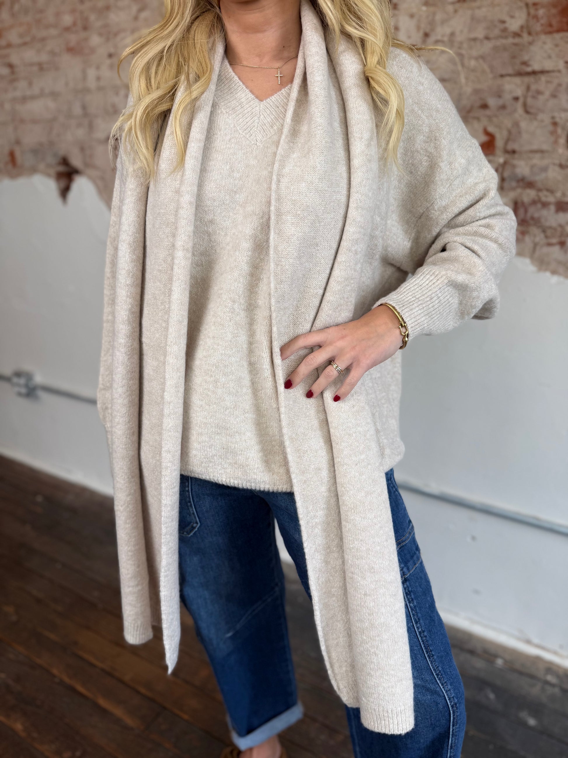 CREAM MARBLED OVERSIZED, V NECK, TRADITIONAL SWEATER WITH SCARF