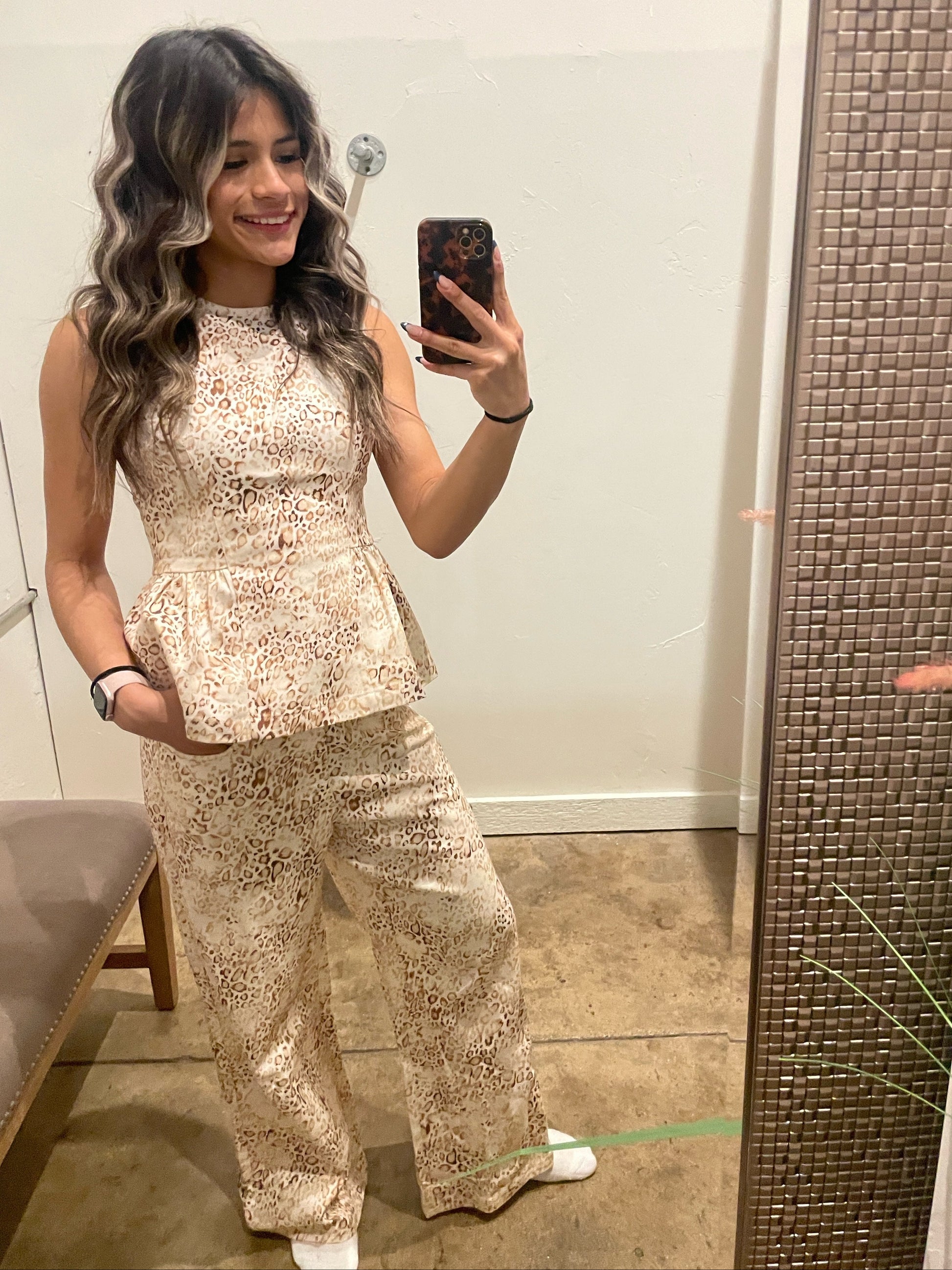 COLORS OF TAN, BEIGE, CREAM, TAUPE, BROWN. BOTTOMS ARE LIGHT WEIGHT DENIM JEANS WITH THE TRADITIONAL FRONT AND BACK POCKETS, ZIPPER AND BUTTON CLOSURE, WIDE STRAIGHT LEG. TOP IS SLEEVELESS, HIGH NECK, RUFFLE HEM, ZIPPER BACK