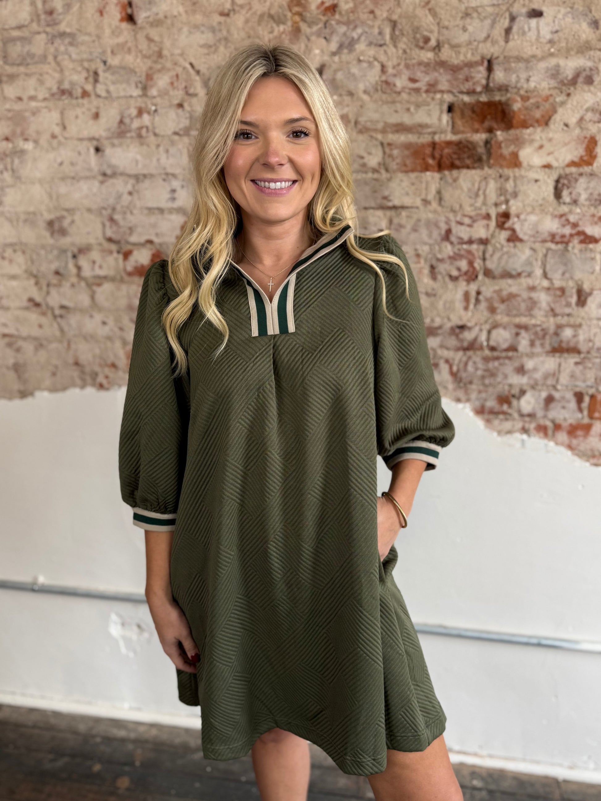 V NECK, OLIVE COLOR, TEXTURED DRESS, WITH PUFF ELBOW SLEEVES AND POCKETS