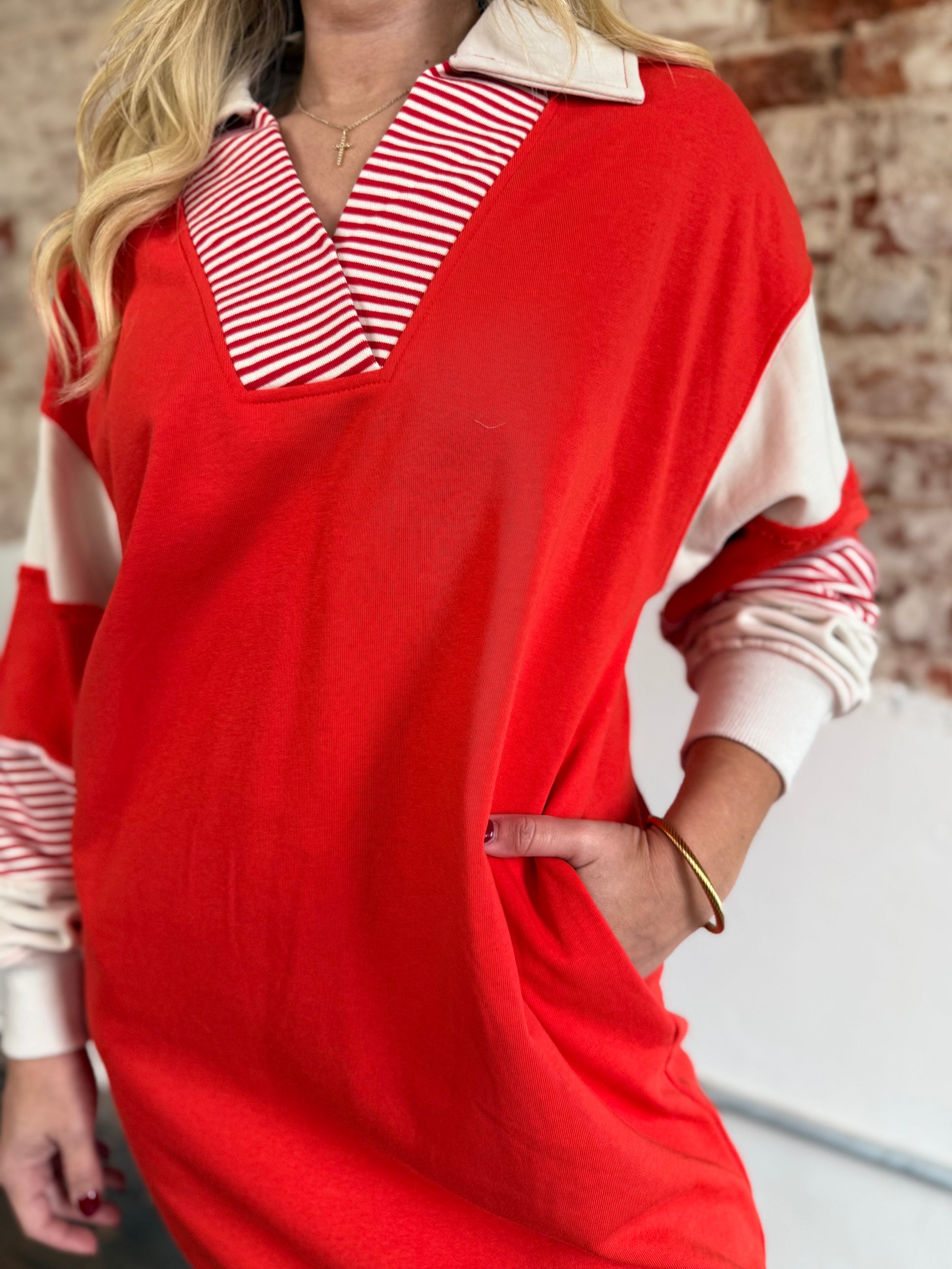 THICK STRIPES, THIN STRIPES, COLORBLOCK, V NECK, COLLAR, LONG SLEEVE SHIRT DRESS WITH POCKETS