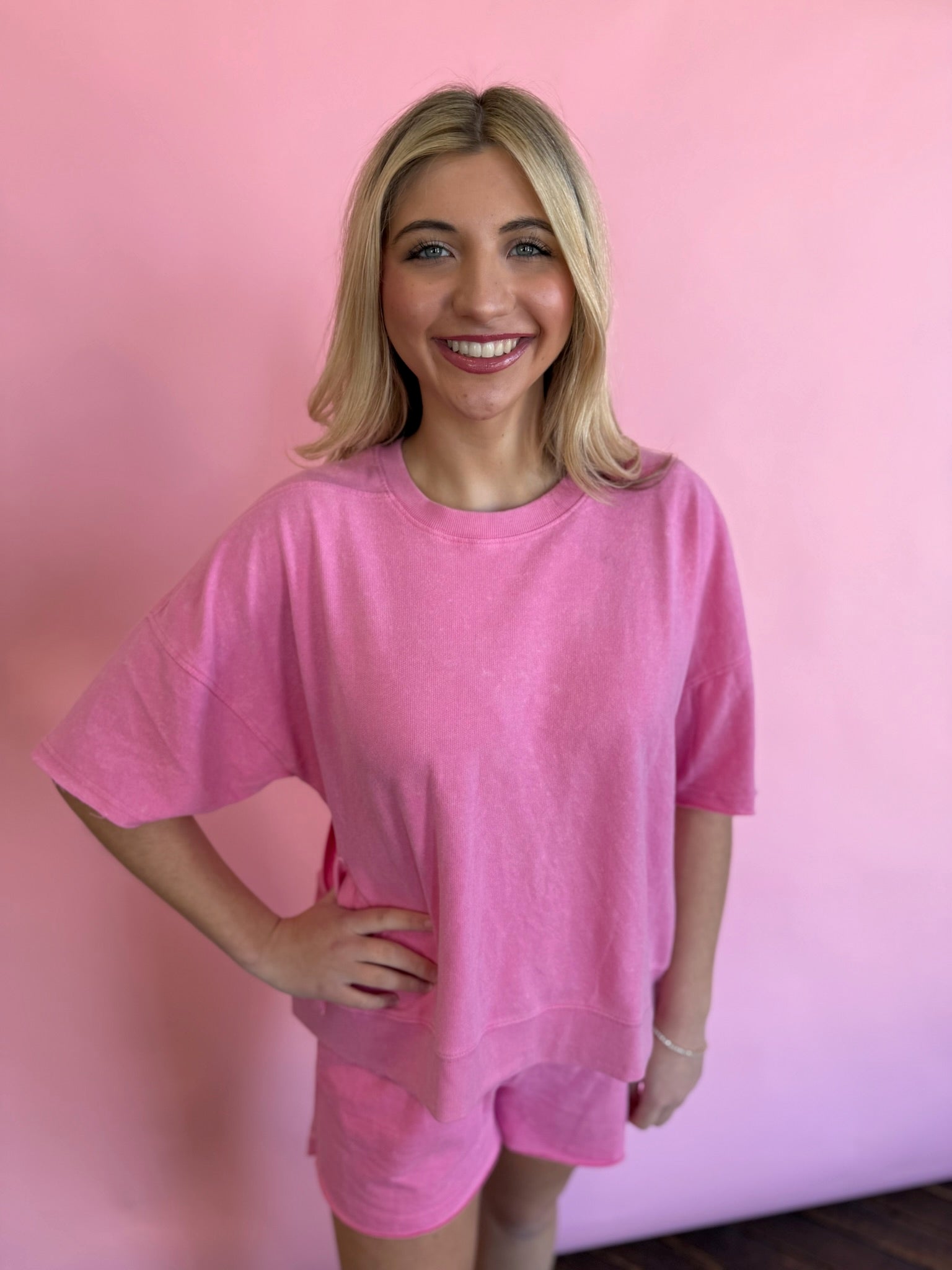 LIGHT WEIGHT TERRY SHORT SET, OVERSIZED, SHORT SLEEVE TOP WITH SIDE POCKET, SHORTS ARE ELASTIC WAIST WITH DRAWSTRING AND POCKETS