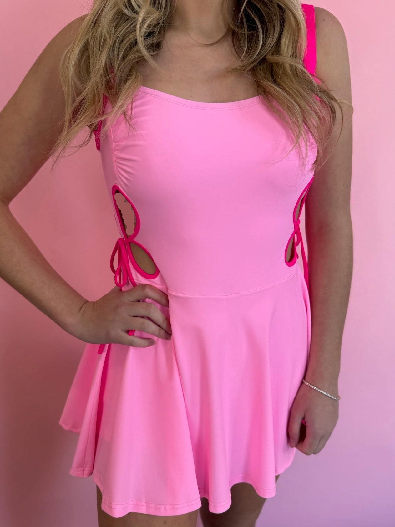 HOT PINK ACCENTS ON PINK ATHLETIC DRESS WITH SHORTS LINER. SHORTS HAVE POCKETS