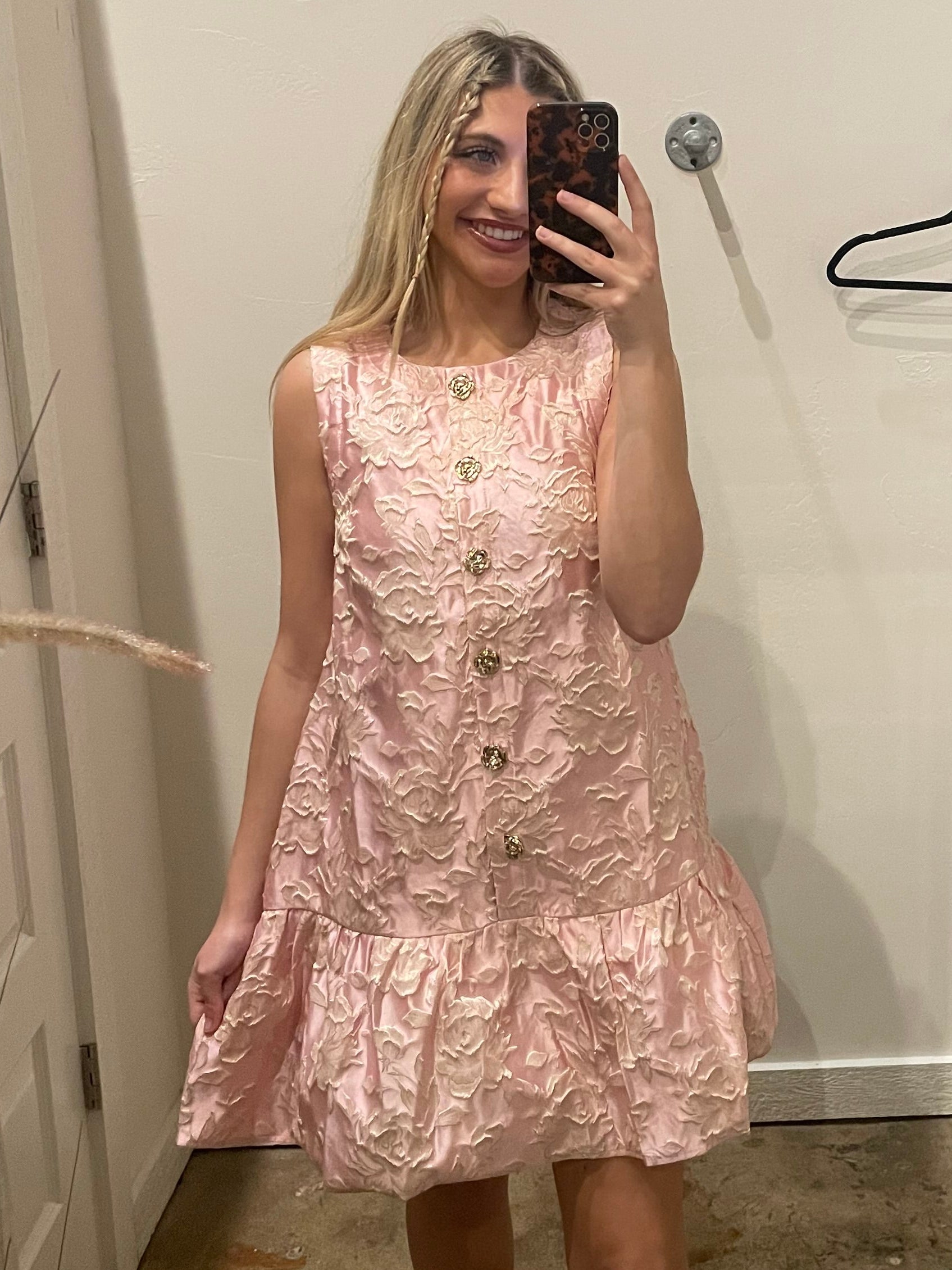 PINK, SHINY, EMBOSSED WITH WHITE AND GOLD ROSES, SLEEVELESS DRESS WITH GOLD BUTTONS AND RUFFLE HEM AND POCKETS