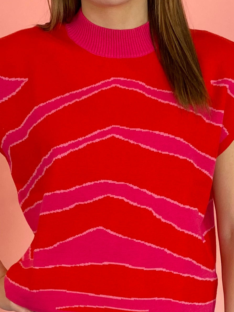 SLEEVELESS, MOCK NECK, LIGHTWEIGHT, SWEATER TOP IN RED WITH HOT PINK AND PINK DESIGN