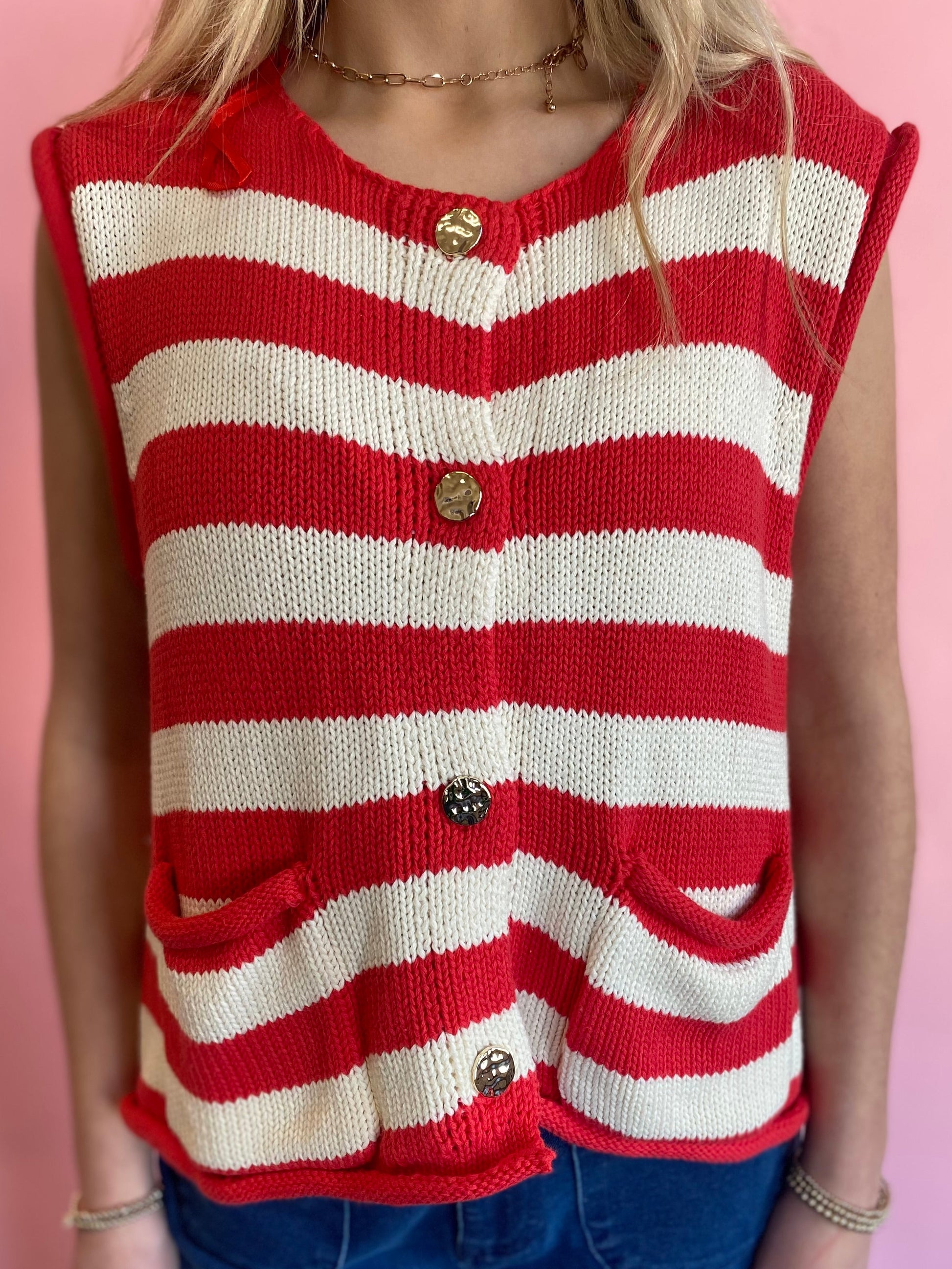 RED AND WHITE STRIPED, SLEEVELESS, BUTTON UP SWEATER VEST WITH GOLD BUTTONS