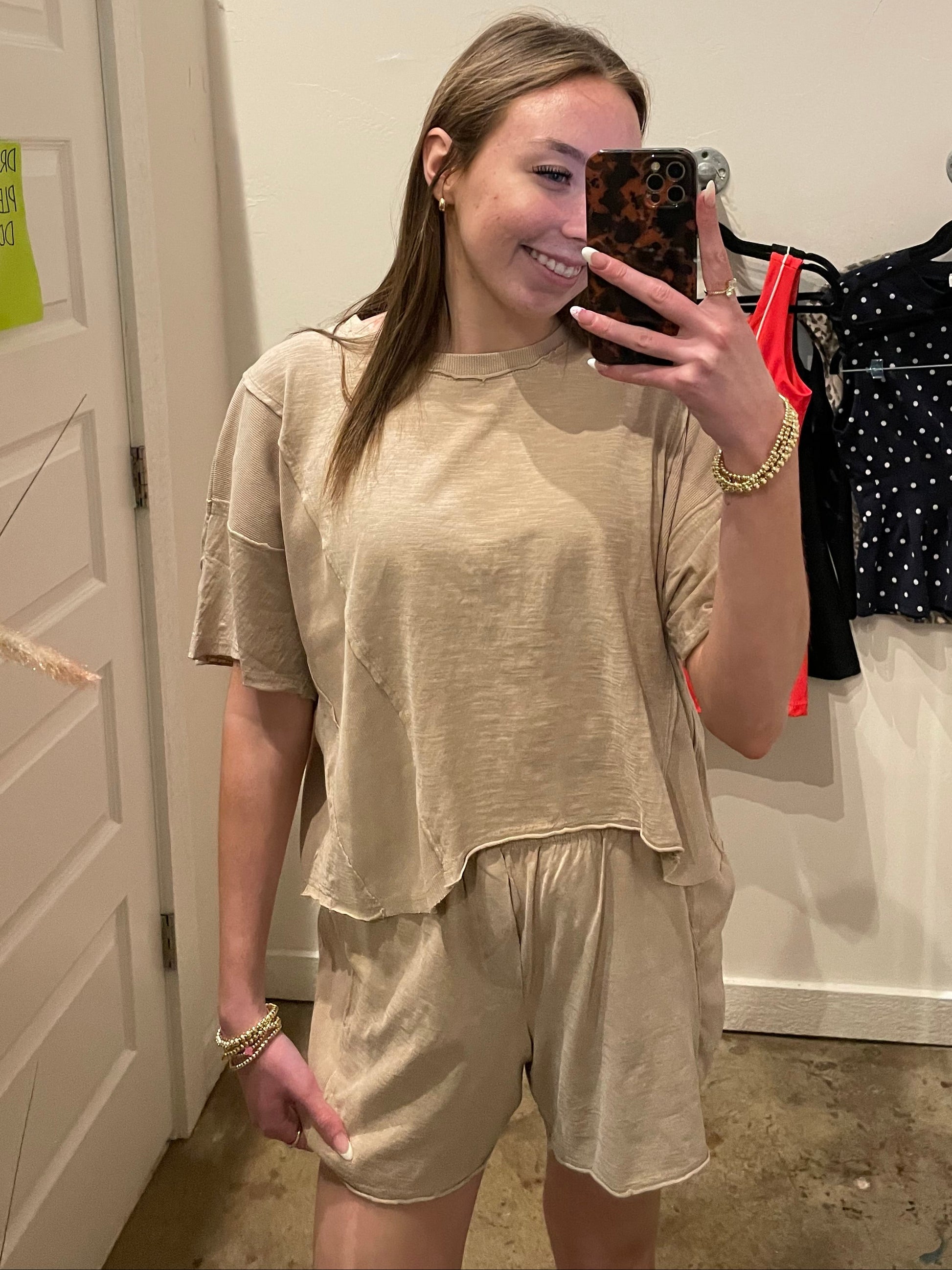 TAN SHORT SET WITH BLOCKED, RIBBING DETAIL AND RAW HEM DETAIL. SHORTS ARE ELASTIC WAIST, DRAWSTRING, WITH BOXER FRONT AND POCKETS, TOP IS SHORT SLEEVE, OVERSIZED, CROPPED