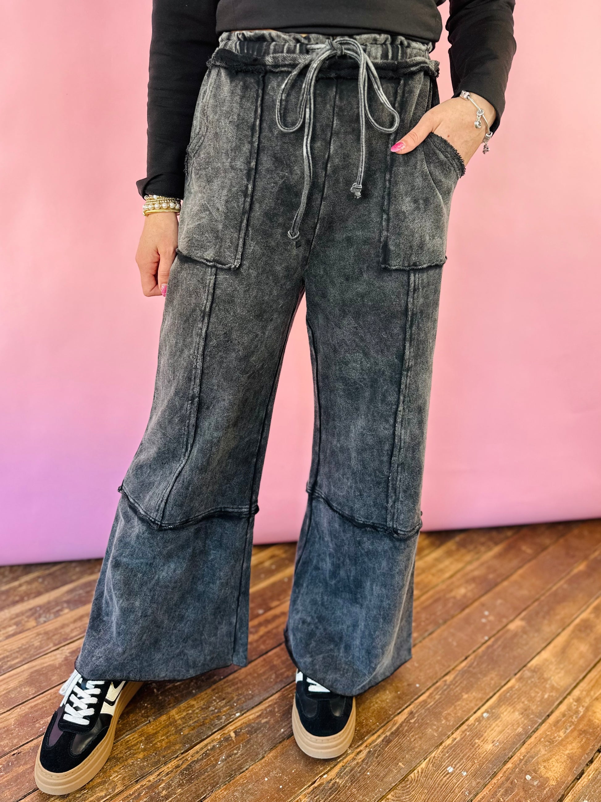 VINTAGE BLACK WASH, WIDE LEG, LOUNGE PANTS WITH ELASTIC WAIST, DRAWSTRING AND FRONT AND BACK POCKETS